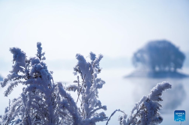 This photo taken on Jan. 30, 2023 shows the rime scenery near the Songhua River in Jilin City, northeast China's Jilin Province. (Xinhua/Yan Linyun)