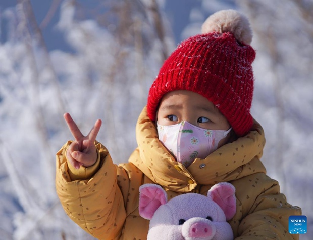A child poses for a photo with rime in Jilin City, northeast China's Jilin Province, Jan. 30, 2023. (Xinhua/Yan Linyun)