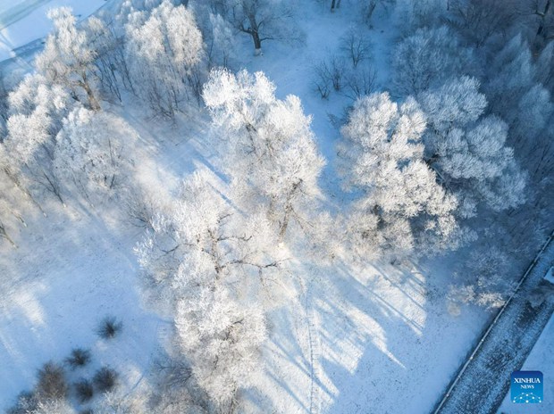 This aerial photo taken on Jan. 30, 2023 shows the rime scenery near the Songhua River in Jilin City, northeast China's Jilin Province. (Xinhua/Yan Linyun)