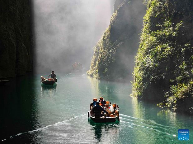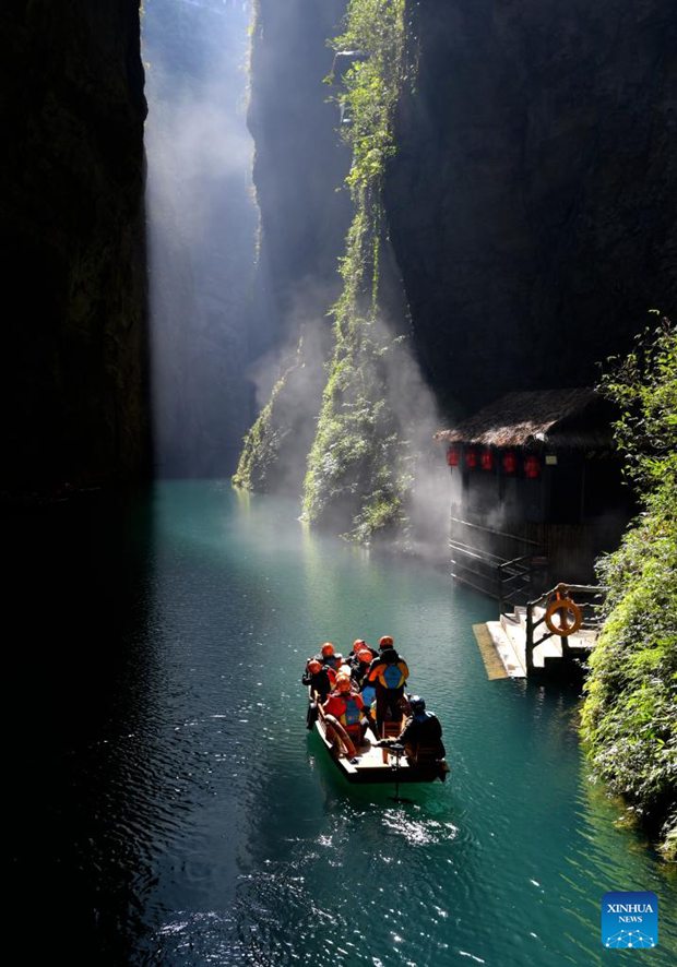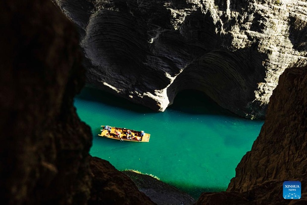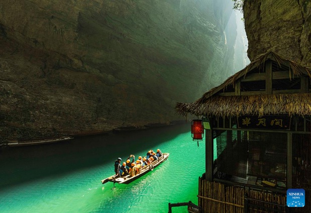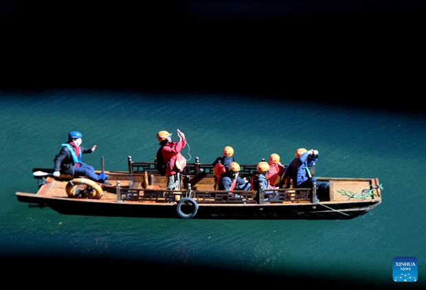 Tourists enjoy boat rides in the Pingshan canyon, a tourist attraction famous for its limpid water, in Hefeng County, central China's Hubei Province, Jan. 28, 2023. (Photo by Yang Shunpi/Xinhua)