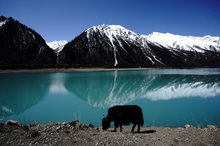 A photo taken on April 27, 2020 shows the scenery of Ranwu Lake in Southwest China's Tibet autonomous region. With snow-capped mountains in the distance, the tranquil turquoise blue lake water looks even more picturesque in spring. [Photo/Xinhua]