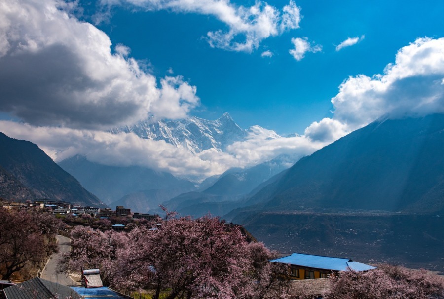 Photo taken on April 1, 2020, shows peach blossoms along the Yarlung Zangbo River Grand Canyon, Southwest China's Tibet autonomous region. The majestic beauty of the snow mountains in the horizon, together with a flowery scene at the foothill creates a unique spring landscape here. The Yarlung Zangbo River Grand Canyon averages 5,000 meters in depth, making it the deepest in the world, followed by the Grand Canyon in the USA and the Colia Grand Canyon in Peru.[Photo/Xinhua]