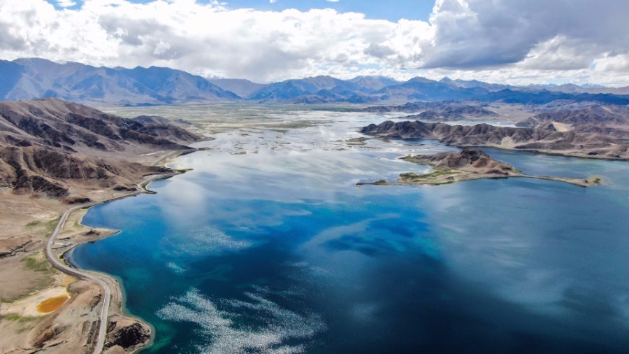 Clouds are reflected and light shimmers on Bangong Lake in this drone picture taken on Aug 3, 2019 in Ali, Southwest China's Tibet autonomous region. The lake is unique in that its salt content increases progressively as the water flows westward. Over 10 small islands are scattered across the waters, enhancing the lake’s beauty, which visitors can enjoy on a sightseeing boating tour.[Photo/Xinhua]