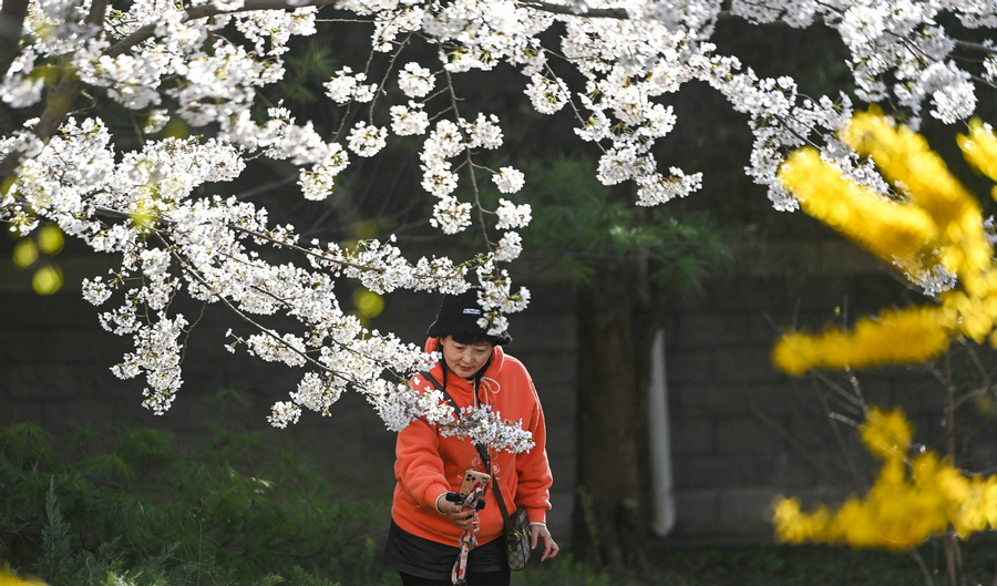 A tourist enjoys cherry blossoms at Yuyuantan Park in Beijing, capital of China, March 27, 2023. [Photo/Xinhua]