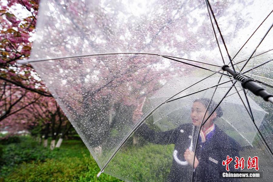 A student takes photos of cherry blossoms amid rain at Guizhou Minzu University in Guiyang, Guizhou province, March 28, 2018. [Photo/Chinanews.com]
