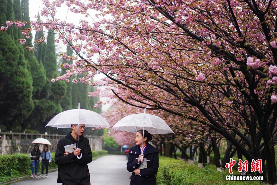 Two students walk under umbrellas at Cherry Blossom Avenue in Guizhou Minzu University in Guiyang, Guizhou province, March 28, 2018. [Photo/Chinanews.com]