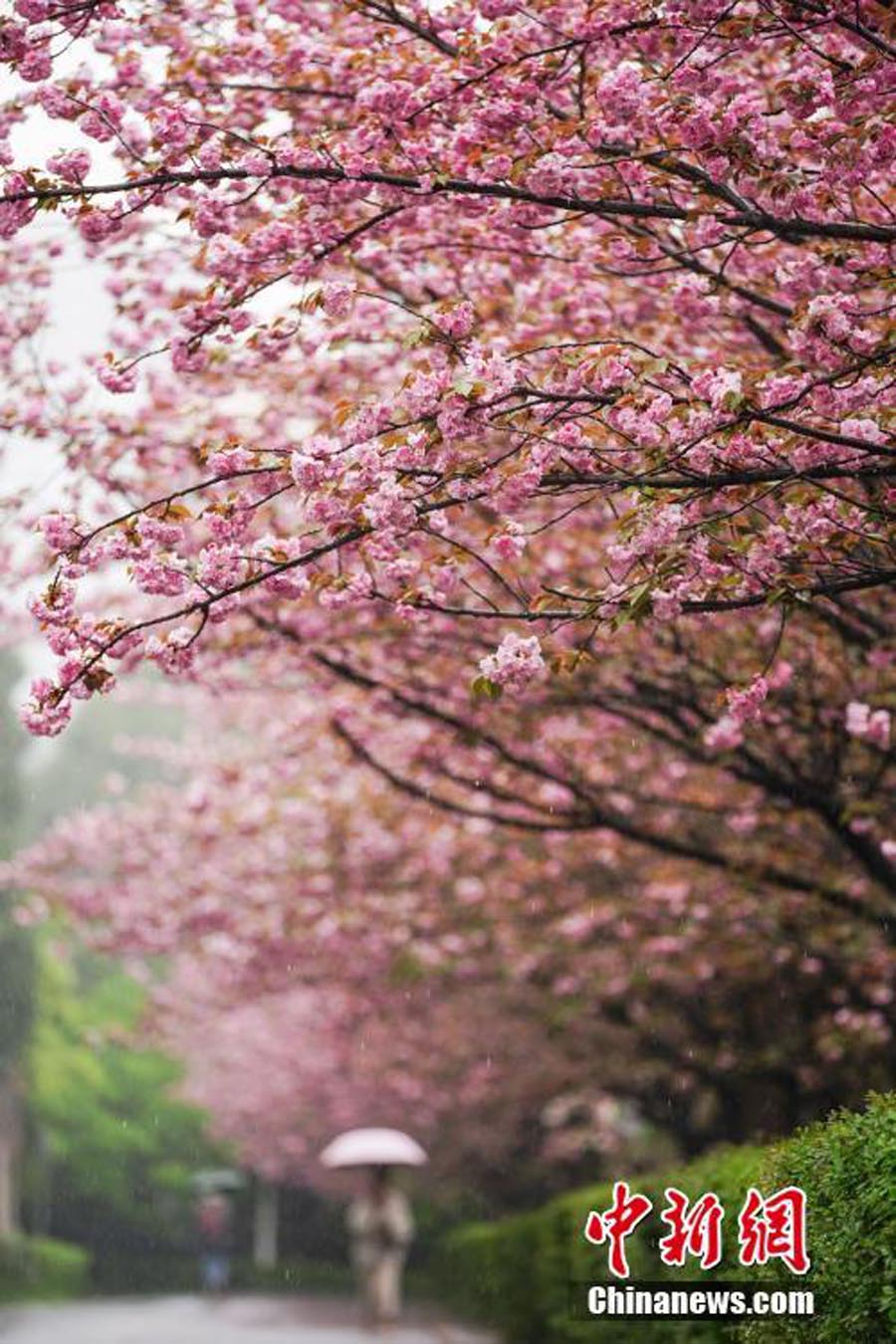 A student walks through misty rain at Cherry Blossom Avenue in Guizhou Minzu University in Guiyang, Southwest China's Guizhou province, on March 28, 2018. [Photo/Chinanews.com]