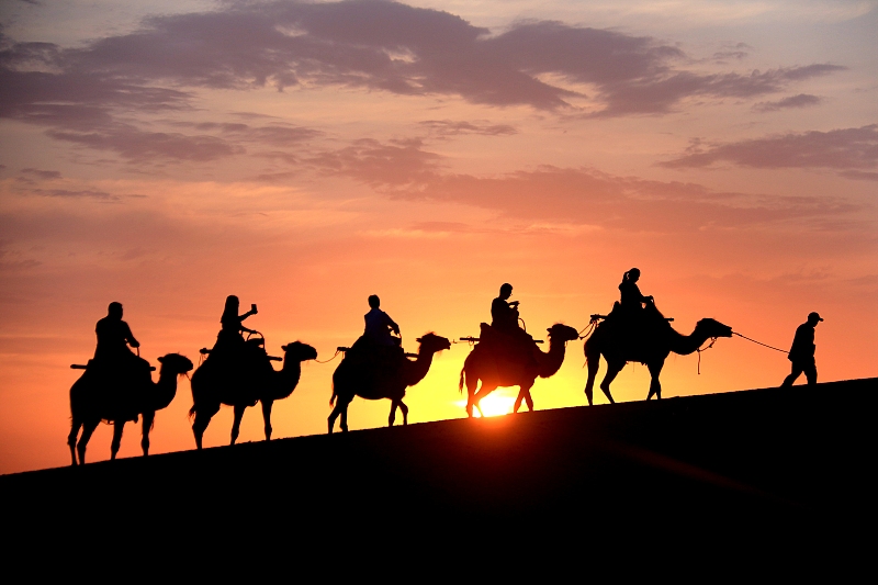 Visitors ride on camels at Mingsha Mountain Crescent Spring Scenic Area, Dunhuang, Gansu Province. /CFP