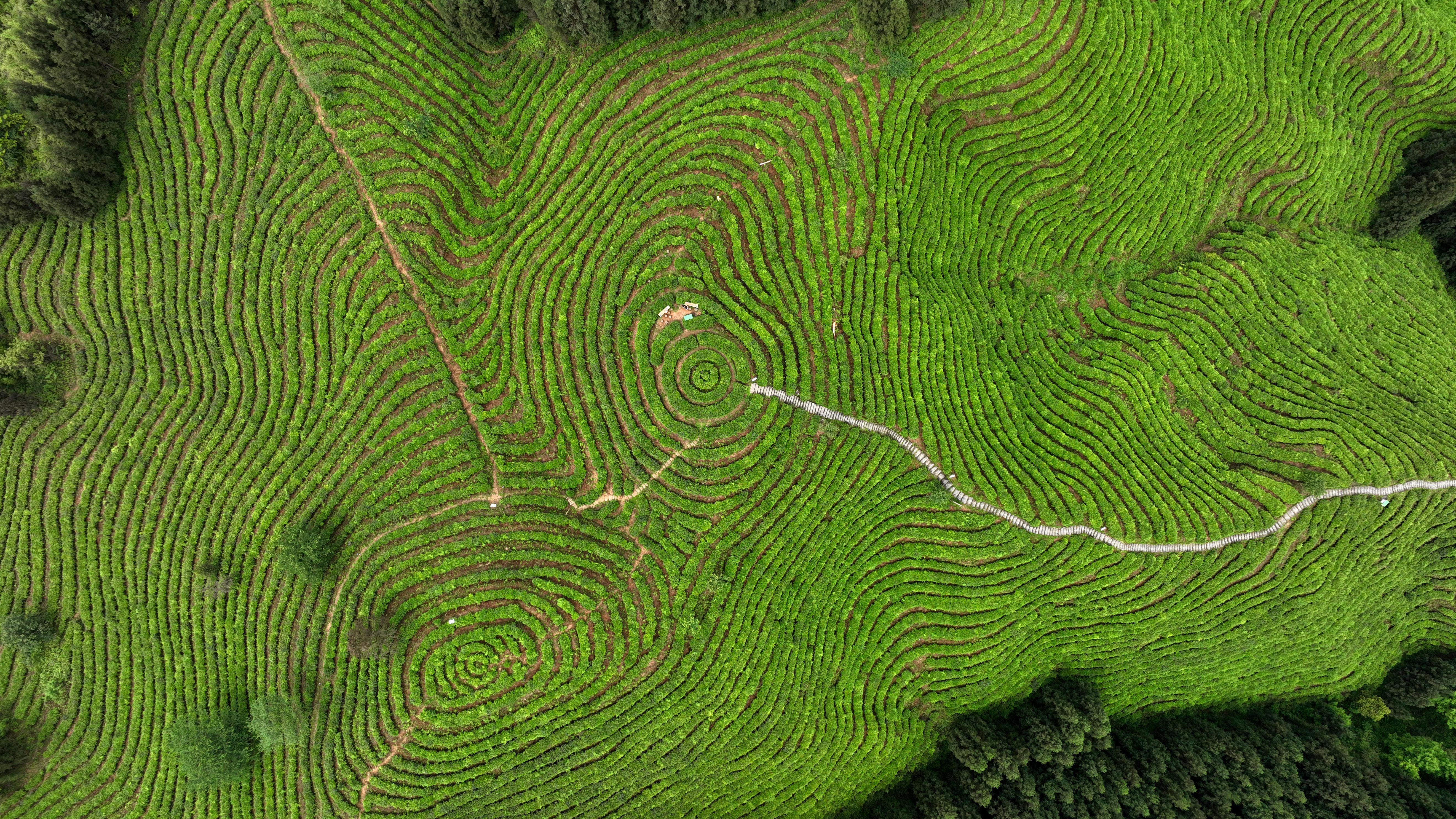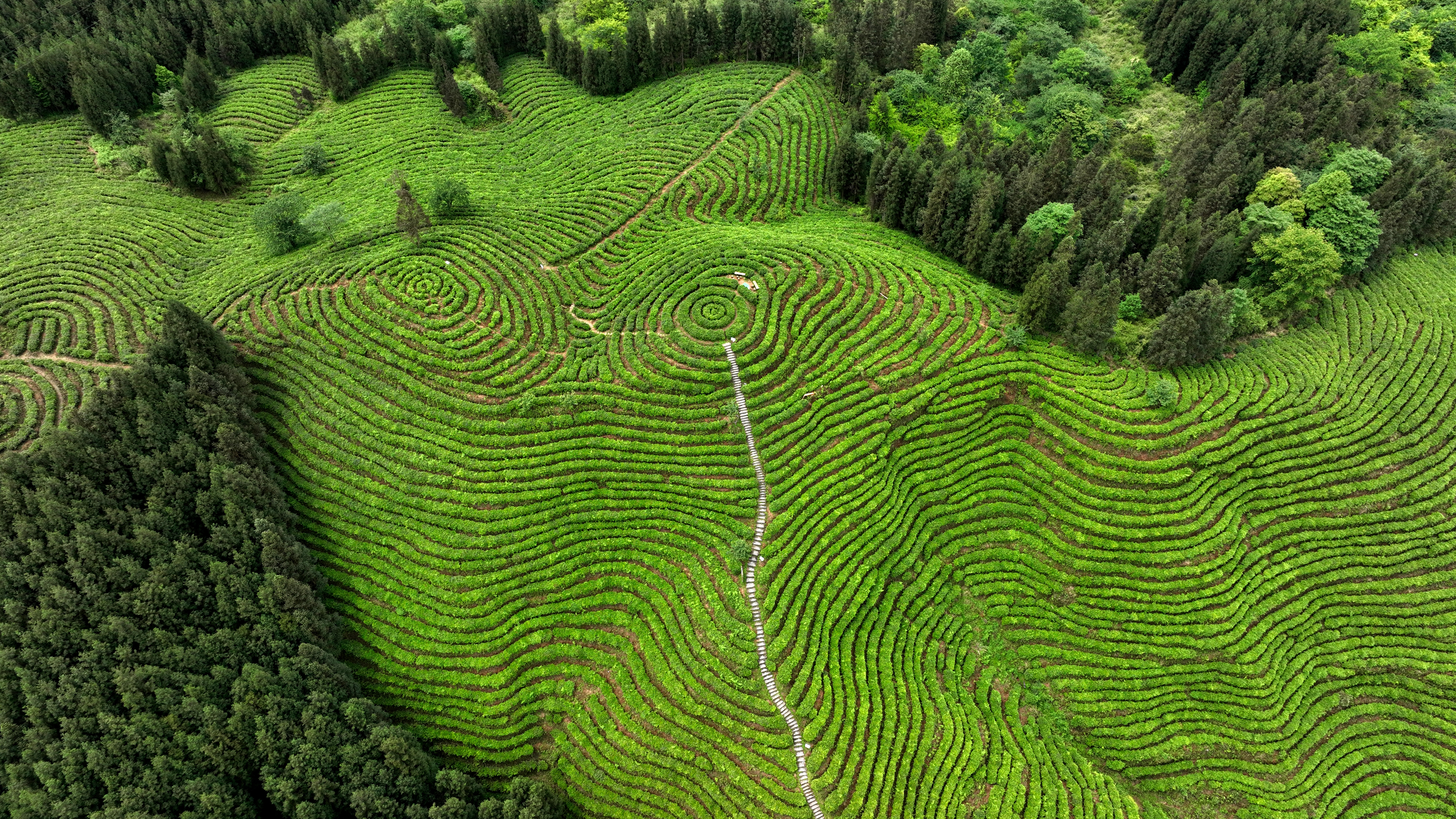 From an aerial perspective, this tea garden in Hongya County, Meishan City, Sichuan Province, resembles a "fingerprint of the Earth."