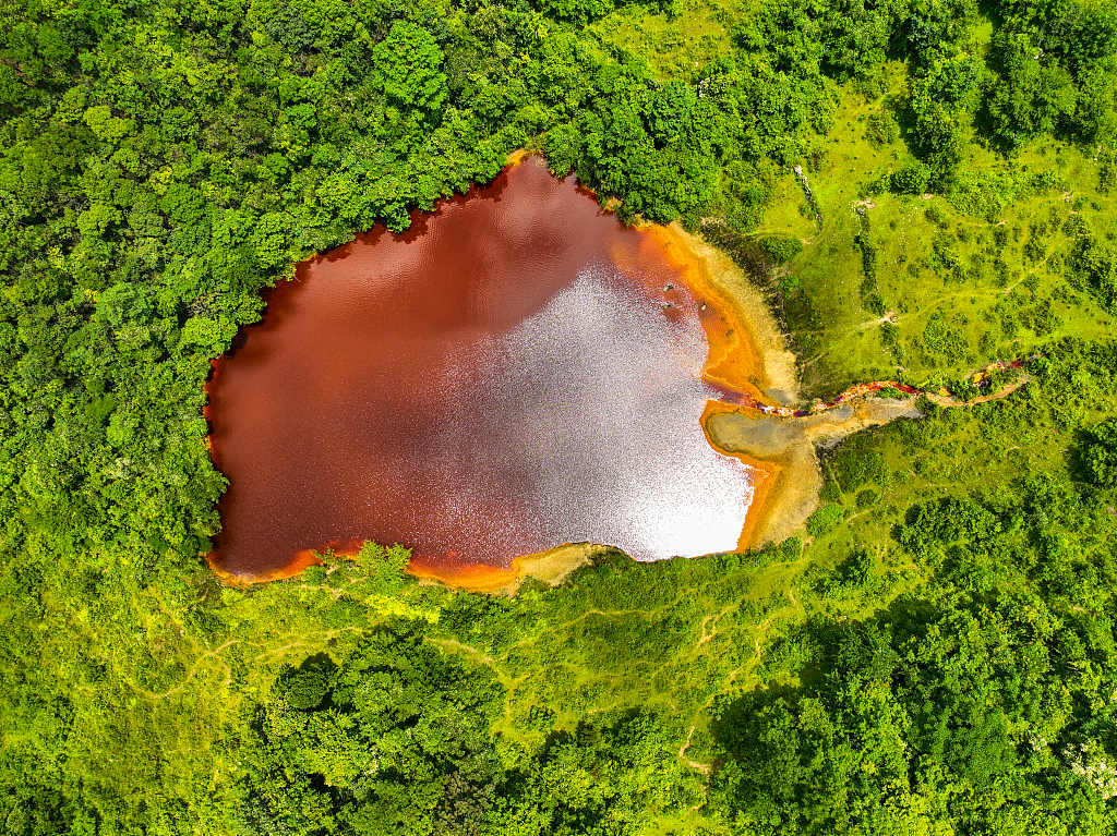 An aerial view of the crimson lake atop Baire mountain in Longli, Guizhou, China, June 26, 2023. /CFP