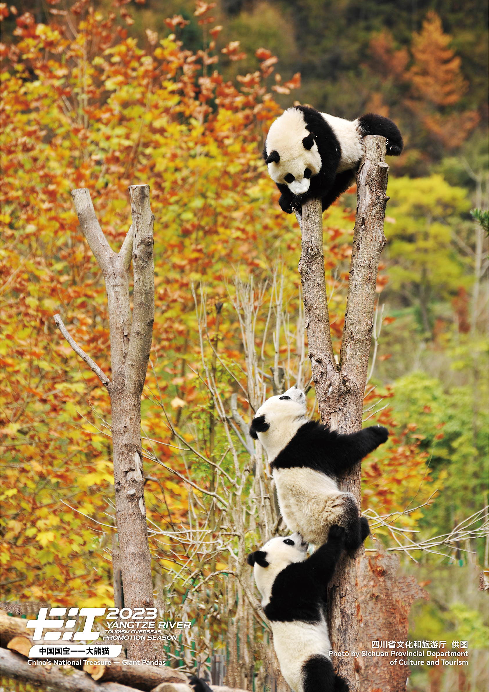 This undated photo shows three giant pandas frolicking in a tree in southwest China's Sichuan Province. /Photo provided to CGTN