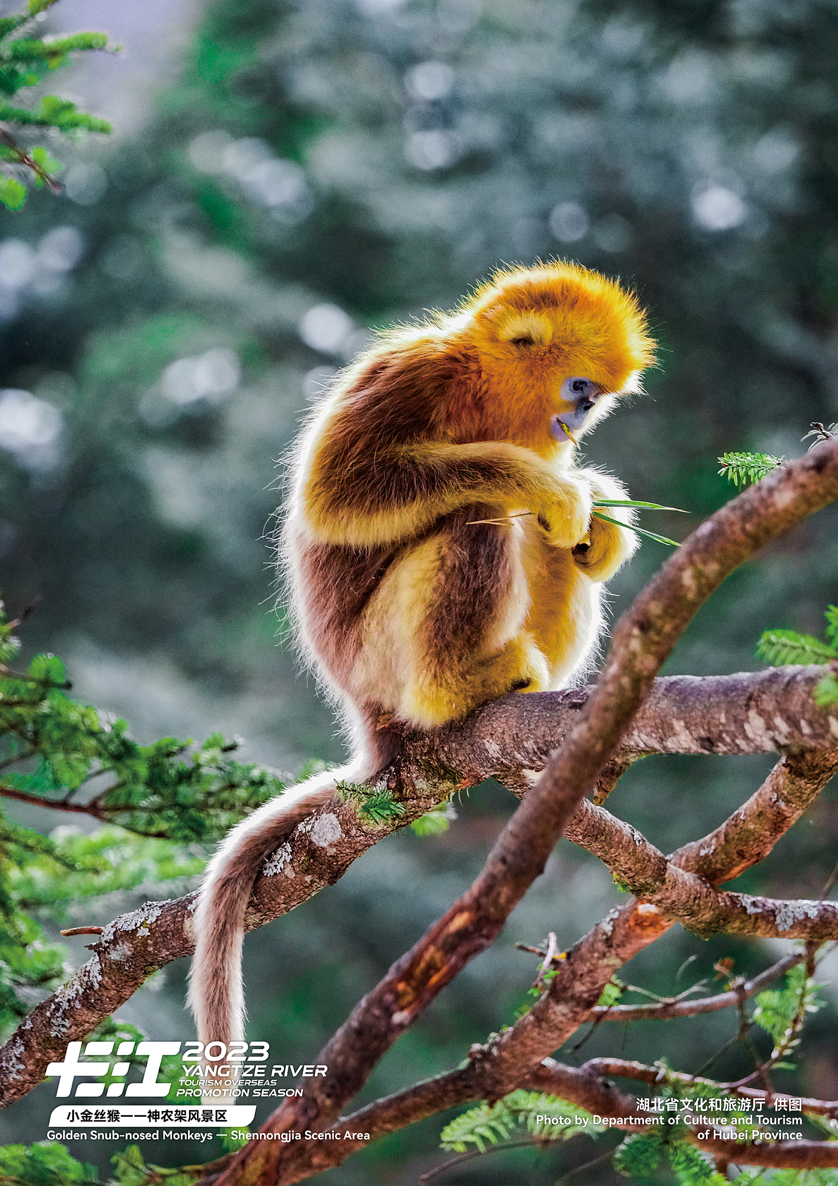 This undated photo shows a golden snub-nosed monkey perching on a tree branch in Shennongjia Scenic Area in central China's Hubei Province. /Photo provided to CGTN