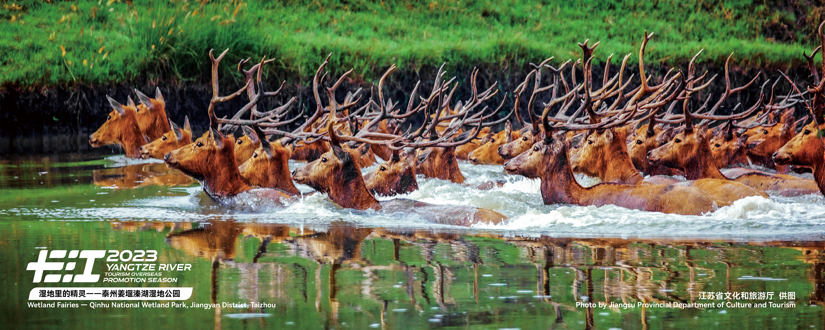 This undated photo shows a herd of wild elks wading through water at the Qinhu National Wetland Park in Taizhou, east China's Jiangsu Province. The park is a major scenic spot on the Yangtze River Basin. /Photo provided to CGTN