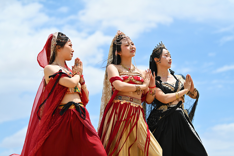 Tourists dressed in traditional costumes pose for photos at the Mingsha Mountain Crescent Spring scenic spot in Dunhuang City, Gansu Province, July 21, 2023. /CFP