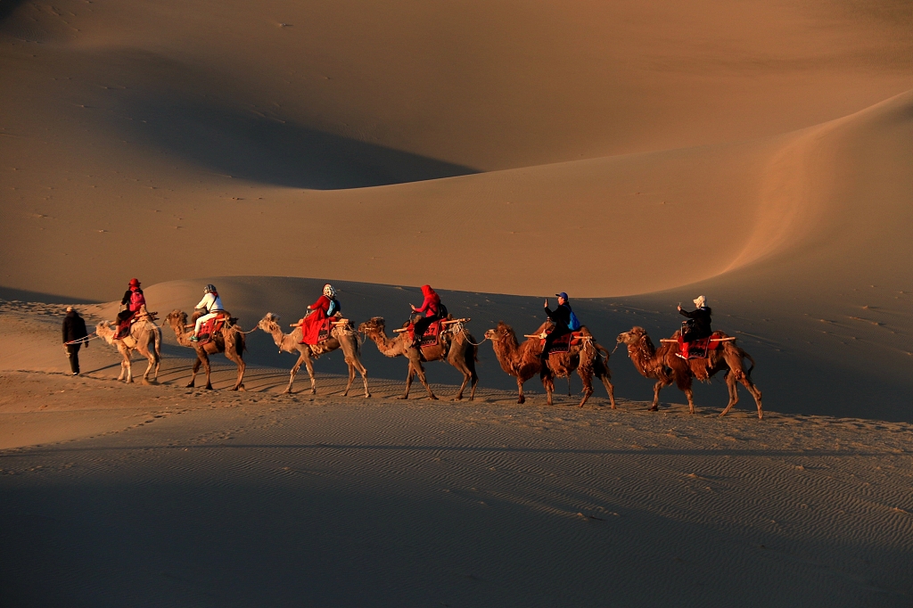 The spectacular desert and a stunning crescent-shaped spring provided a dramatic backdrop for the tourists who dressed up in traditional Chinese costumes to take photos at the Mingsha Mountain Crescent Spring scenic spot in Dunhuang City, Gansu Province. As online videos and livestreams about Dunhuang dance continue to gain popularity, many tourists visit the famous scenic spot to gain a unique travel experience.