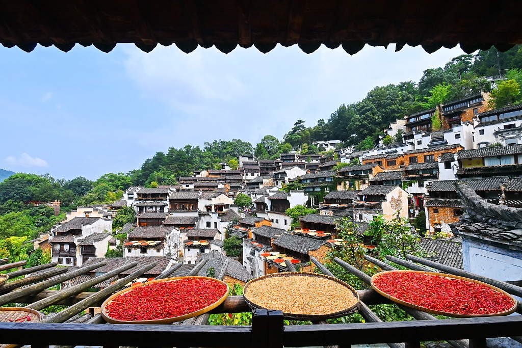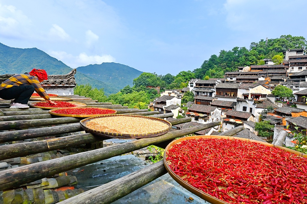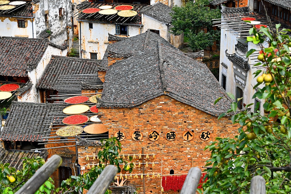 It's a custom for villagers in Huangling Village, Jiangxi Province to sundry (or "shaiqiu" in pinyin) a variety of crops on the building rooftops, creating a stunning contrast to the white- and-grey-colored Hui-style buildings.
