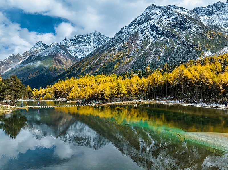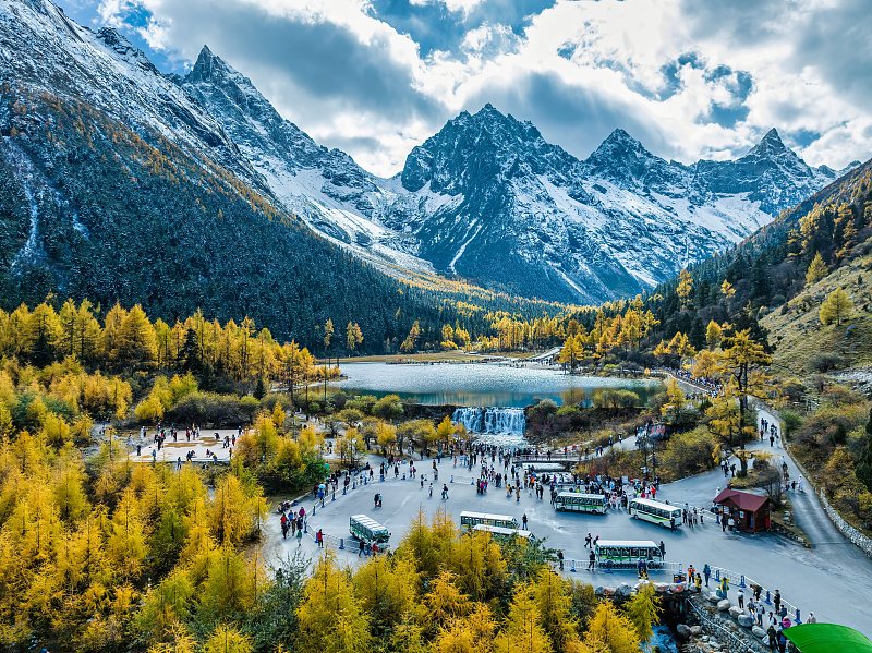 Snow-covered mountains are providing the perfect backdrop to the crystal clear waters and vast swathes of colorful autumnal forests, offering a real-life fairytale scene to visitors to Bipenggou Valley in Aba Tibet and Qiang Autonomous Prefecture, Sichuan Province. The area is a natural ecological attraction, where its primitive landscapes and stunning scenery offer a variety of outdoor activities, such as hiking, skiing and skating.