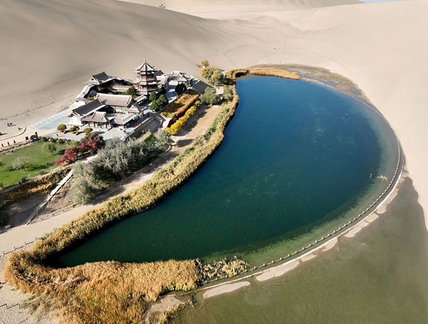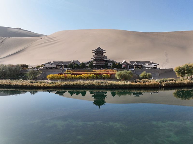 The Mingsha Mountain Crescent Spring Scenic Area is one of the most precious gifts from nature that China has to offer. The crescent moon-shaped spring looks like a diamond sparkling in the desert. The name "Mingsha" derives from the sound made when the wind blows over the dunes. This beautiful oasis is adorned by green and yellow trees in autumn, providing a picturesque backdrop to visitors who travel to embark on an amazing desert adventure in Dunhuang City, Gansu Province.