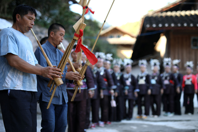 Miao performers play the lusheng, a traditional instrument, at the Chixin Festival in Danzhai County, Qiandongnan Miao and Dong Autonomous Prefecture, Guizhou Province, November 6, 2023. /CFP