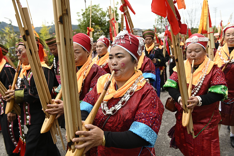 Lusheng performers play traditional music to celebrate the Lusheng Festival at Gulong Town, Huangping County, Qiandongnan Miao and Dong Autonomous Prefecture, Guizhou Province, on November 10, 2023. /CFP