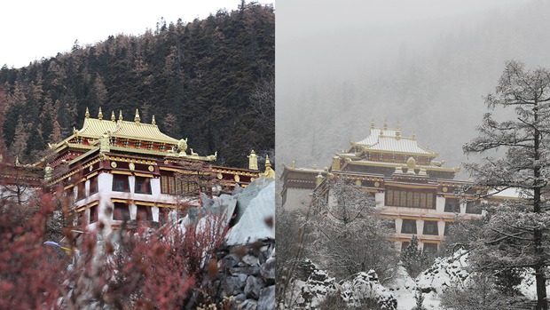 Chonggu Temple, a Tibetan Buddhism temple at Daocheng Yading Nature Reserve in Ganzi, Sichuan, is seen before (left) and after snow. /CGTN