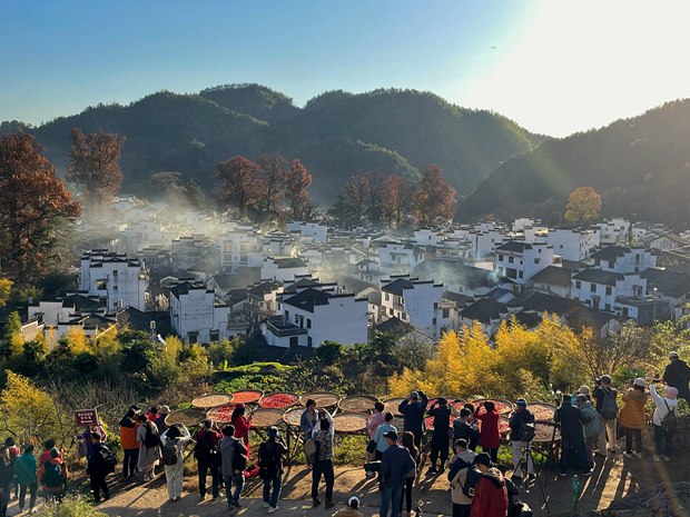 The picturesque views of Shicheng Village in Wuyuan County, east China's Jiangxi Province look like a fairy-tale world especially during early morning when it's shrouded in mist. The village is famous for its traditional black-and-white residences and beautiful maple leaves, attracting many tourists to enjoy the unique scenery.