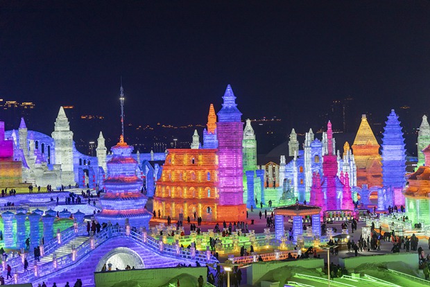 A night view of Harbin Ice-Snow World theme park in Harbin, northeast China's Heilongjiang Province. /CFP