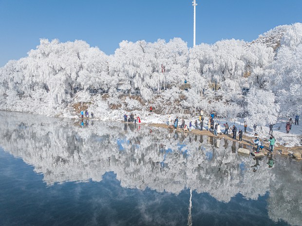 Tourists enjoy rime scenery in the city of Jilin, northeast China's Jilin Province, on November 12, 2023. /CFP