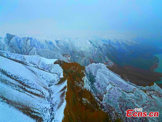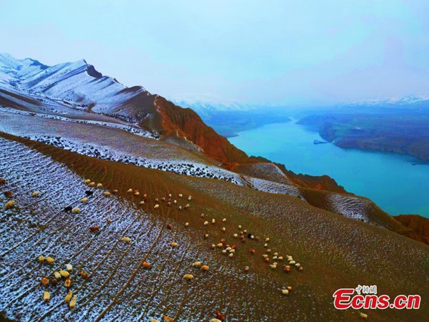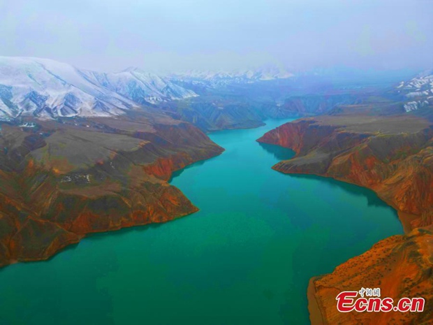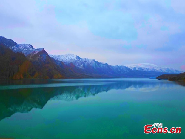 Tranquil scenery with snow-covered Nuerga Canyon is reflected in water of Nuerga Reservoir in Changji Hui Autonomous Prefecture, northwest China's Xinjiang Uyghur Autonomous Region. (Photo: China News Service/Liu Hua)
