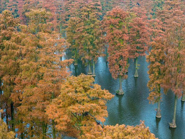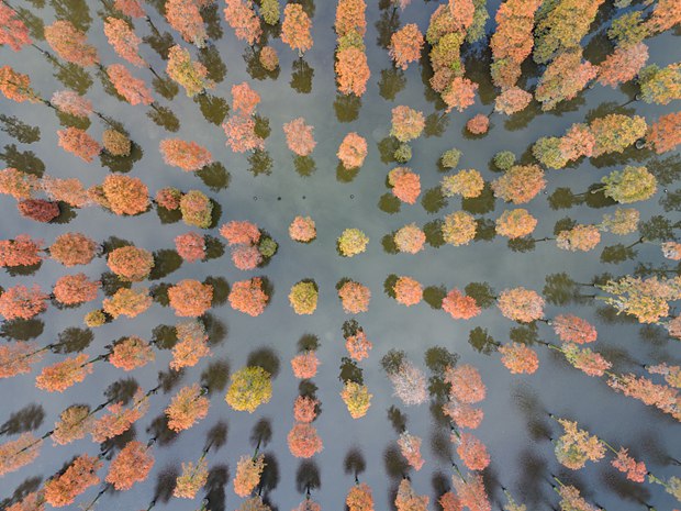 The changing colors of the forests at the Zhangdu Lake Wetland transformed this popular attraction in Wuhan City, Hubei Province into a sea of red and yellow hues in the early winter light, offering visitors the chance to boat through the partially submerged forest.