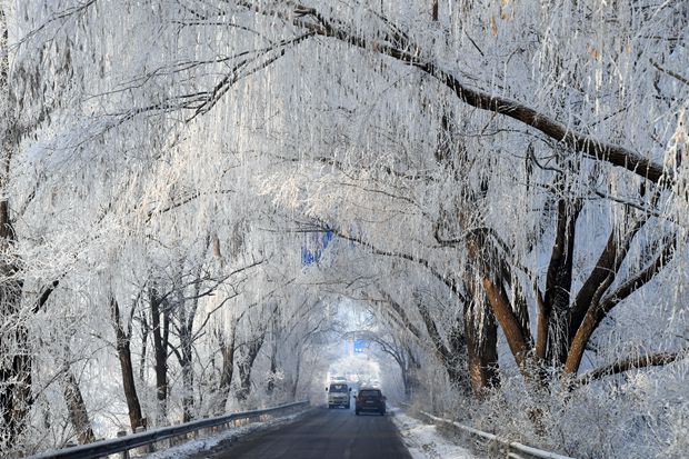 Trees enveloped by rime along the frozen Hunhe River in Shenyang, northeast China's Liaoning Province, are seen stretching skywards on December 25, 2023./IC