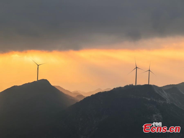 Golden light breaks through clouds at sunset, forming the Tyndall effect over a mountain in Wufeng Tujia Autonomous County, central China's Hubei Province, Dec. 23, 2023. (Photo: China News Service/Zhou Xingliang)