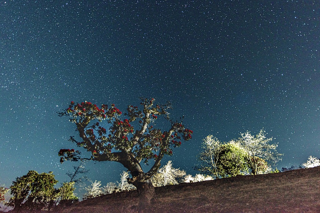 Photos taken on March 3, 2024, shows azalea blossoms under a starry sky in Yunnan Province. /CFP