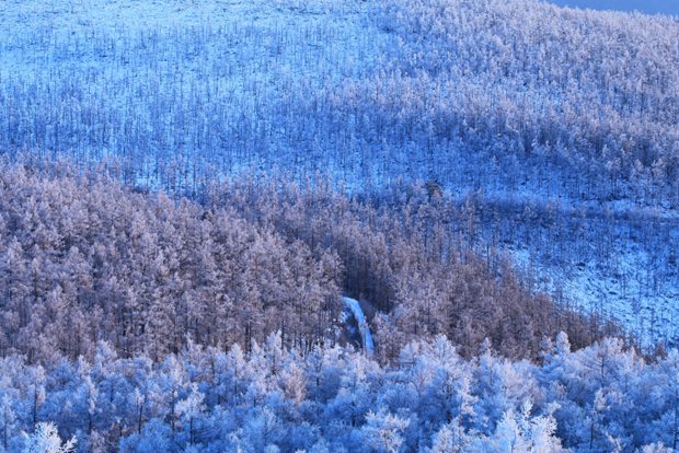 A file photo shows a bird's-eye view of the icy forests in the Greater Khingan Mountains in northeast China. /CFP