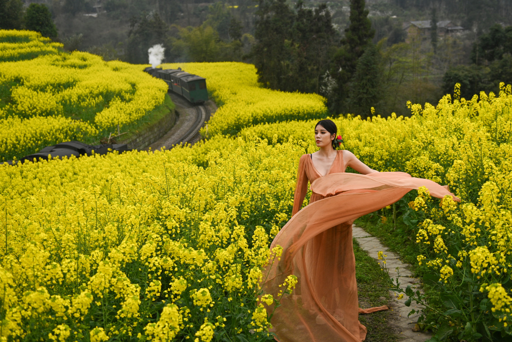 A woman walks through rapeseed flower fields near the railway of the Jiayang steam train in Qianwei County of Leshan, Sichuan Province, March 12, 2024. /CFP