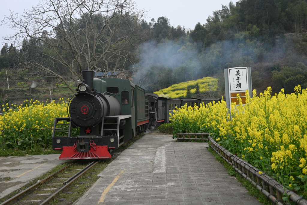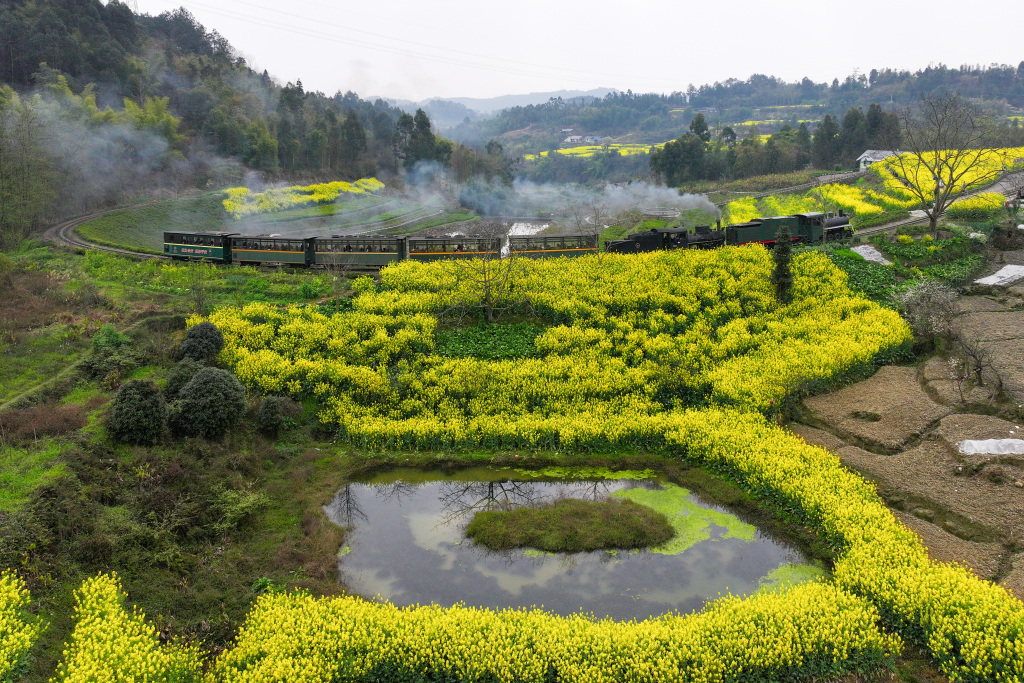 The Jiayang steam train passes through rapeseed flower fields in Qianwei County of Leshan, Sichuan Province, March 12, 2024. /CFP