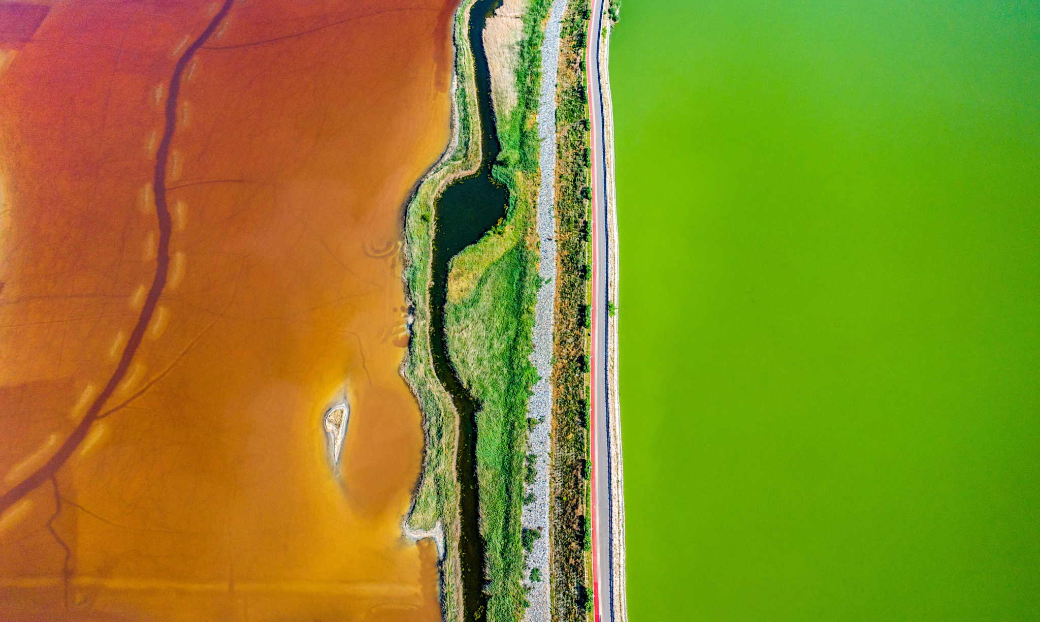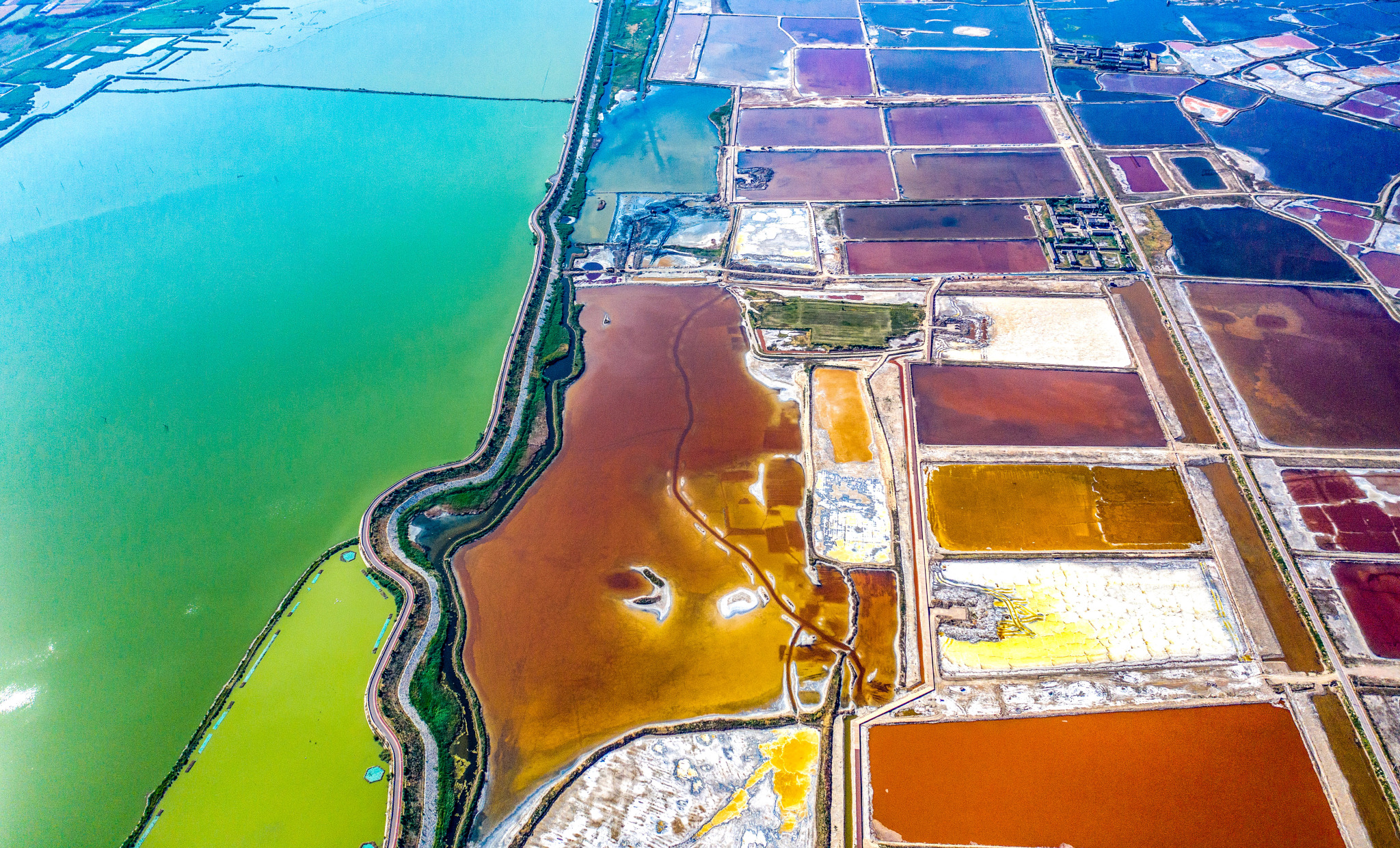 A sustained summer heat wave with temperatures soaring above 37 degrees Celsius has brought a breathtaking transformation to the millennium-old salt lake in Yuncheng, north China's Shanxi Province. From an aerial perspective, the lake resembles a huge artist's palette, offering a visual feast of vibrant colors.