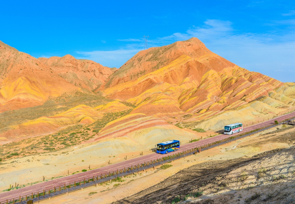 Busses pass through the Colorful Danxia Scenic Spot in Zhangye, Gansu on June 25, 2024. /CFP