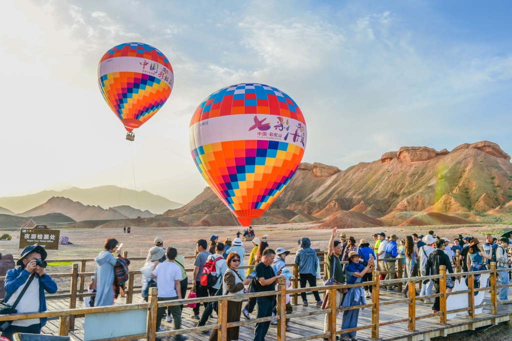 Hot air balloons float above the Colorful Danxia Scenic Spot in Zhangye, Gansu Province, giving visitors unparalleled views of the rainbow-like terrain. Danxia is a unique landform in China, characterized by red stone and multicolored cliffs and ridges. At the foot of the Qilian Mountains, shades of red, light green, brown, and white unfurl across the hillside, formed by eons of erosion. In recent weeks, the scenic spot has seen a boom in tourism, a testament to the popularity of northwest China's summer attractions.