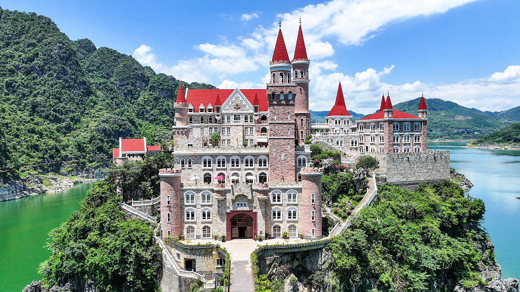 As if growing directly from deep water, the spires of a Gothic-style resort building tower above Wanfeng Lake. This is Jilongbao, nicknamed "Chinese version of Neuschwanstein castle," in Xingyi City, Guizhou Province. Due to its stunning, fairy-tale scenery and unique geographical location, standing alone in the center of the lake, Jilongbao attracts countless tourists.