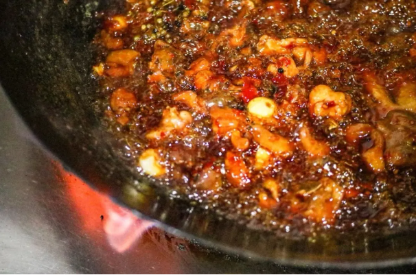Spicy chicken hotpot is a classic in Guizhou cuisine. The chicken pieces, stir-fried with sticky rice chili paste, serve as the flavorful base of the hotpot. Not only can the chicken be enjoyed on its own, but by adding water and salt, the dish transforms into a hotpot broth for cooking an assortment of vegetables, meats, and other ingredients.