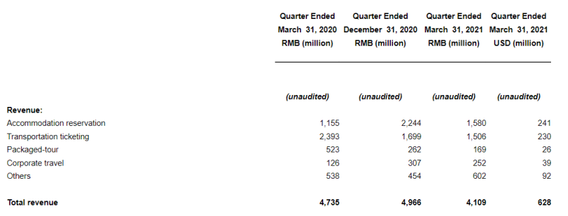 Packaged-tour revenue for the first quarter of 2021 was RMB169 million (US$26 million), representing a 68% decrease from the same period in 2020, and a 35% decrease from the previous quarter.