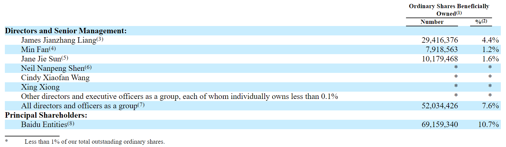 As of January 31, 2023, the beneficial ownership of the group’s ordinary shares by major directors and executive officers is as follow: James Jianzhang Liang (Co-founder and Executive Chairman of the Board, 4.4%), Jane Jie Sun (CEO, 1.6%) and Min Fan (Co-founder and Vice Chairman of the Board and President, 1.2%).