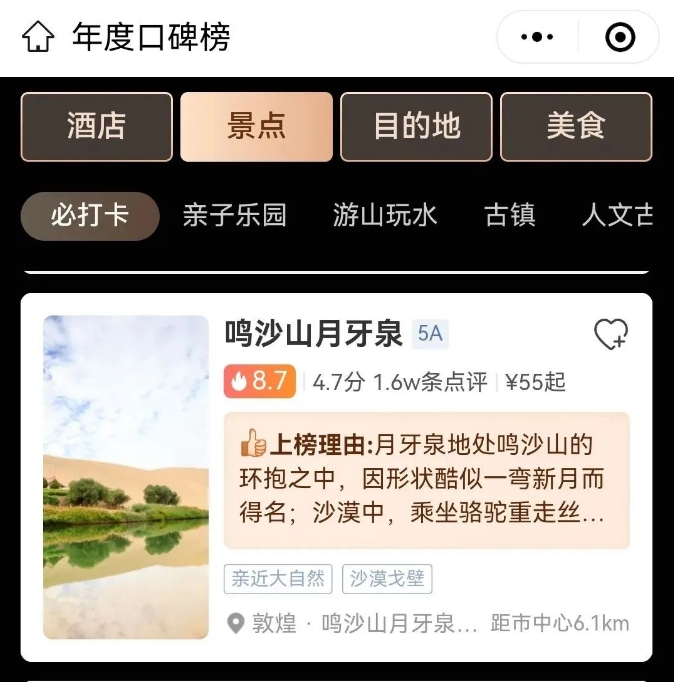 The 2023 Ctrip Reputation Annual List divided into ten popular themes such as must-visit spots, parent-child playgrounds, and tourism destinations. It selects reputation scenic spots based on theme fit, scenic spot visit volume, search index, user rating, time on the list and other comprehensive performance indicators. The platform uses billions of data to back up the evaluation system. Based on user travel reviews and order GMV, through scientific, fair, and professional evaluation systems, the reputation list is selected to answer various questions about Dunhuang tourism. Currently, more than 70% of Ctrip users will browse the reputation list to get travel inspiration. Every two opened users have one being influenced by the list. The Mysterious Land of the Grotto and Crescent Lake Scenic Spot appearing on the Ctrip reputation list as a must-visit scenic spot not only answers various questions about Dunhuang tourism for tourists but also enhances the flow and exposure rate of the scenic area. It also reflects that the operation and service quality of the scenic area have won dual recognition from tourists and the industry this year.