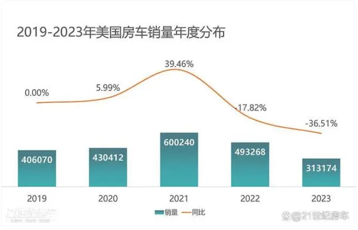 According to the research statistics of the Recreation Vehicle Industry Association (RVIA) on manufacturers, the total sales volume of RV in 2023 was about 313,147, down 36.5% year-on-year from 493,268 in 2022 and down 47.8% year-on-year from the historical peak data in 2021, showing a downward trend for two consecutive years.