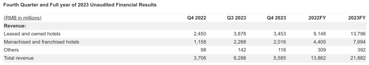 Revenue increased 50.7% year-over-year to RMB5.6 billion (US$786 million) in the fourth quarter of 2023.Revenue from the Legacy-Huazhu segment in the fourth quarter of 2023 was RMB4.4 billion, which increased 59.0% year-over-year.