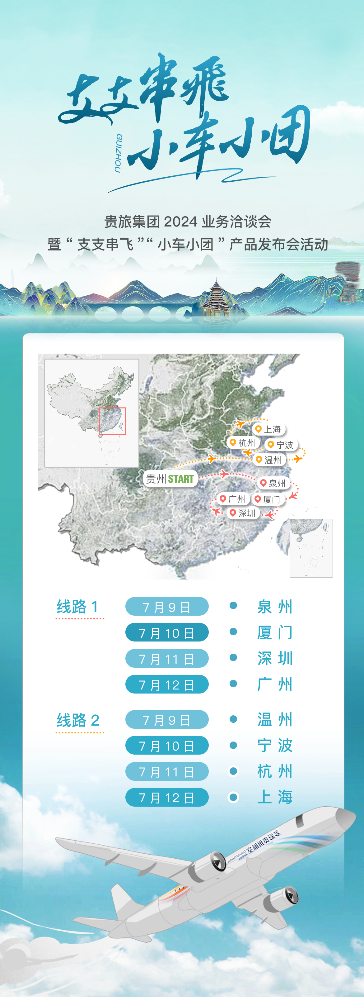 According to the introduction, this activity, Guizhou Tourism Group focused on promoting the "Branch-to-Branch Flying" and "Small Car Group" projects, and released the "Branch-to-Branch Flying '2+X' " boutique route products on the spot, covering two tourism products of "Guiyang=Xingyi=Libo=Tongren" and "Guiyang=Maotai=Libo=Anshun", which can provide tourists with exclusive customized services such as airport waiting, small car small group, scenic spot VIP, special catering, quality accommodation, etc.