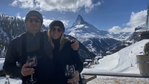 The writer and her husband in Zermatt, Switzerland, last year before they rushed back to the US amid the raging pandemic.