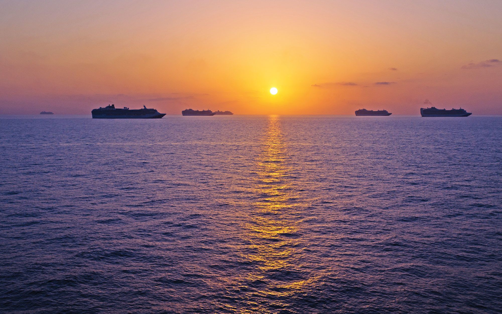 Cruise ships moored off the coast of Bimini, Bahamas, during the Covid-19 shutdown of the cruise industry. (Photo by STUDIO MELANGE/Shutterstock.com)