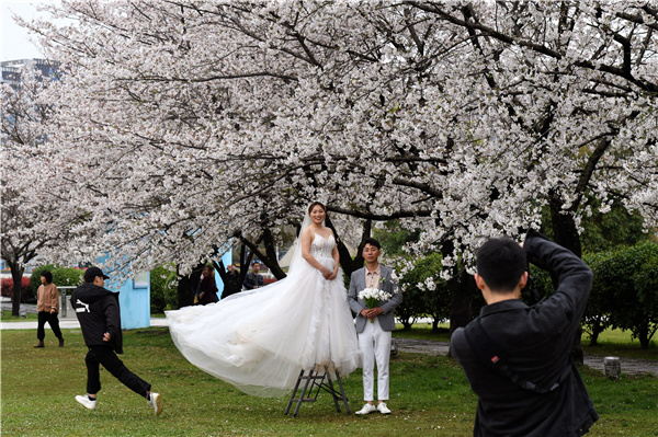 A couple have wedding photos taken among blossoms at a park in Jinhua, Zhejiang province on March 20, 2021. [Photo/Asia News Photo]